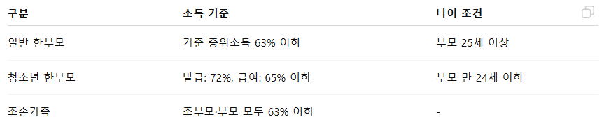 - 일반 한부모가족: 부모 중 한 명이 자녀를 양육하며, 부모 연령이 만 25세 이상