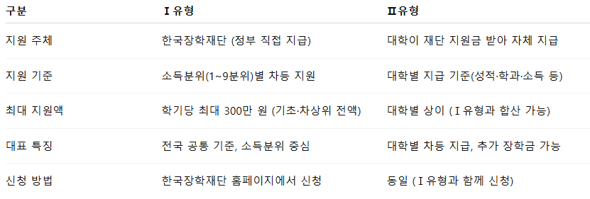 따라서 같은 소득분위라도 대학별로 지급 금액이나 방식이 다를 수 있습니다. 일부 대학은 Ⅰ유형과 Ⅱ유형을 합산해 등록금 전액을 맞춰주기도 하고, 성적이나 학과 특성에 따라 추가 혜택을 주기도 합니다. 즉, Ⅱ유형은 “대학이 정부 지원금을 활용해 맞춤형으로 지급하는 장학금”이라고 이해하면 됩니다.